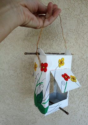 Para finalizar eleve as abas da caixa e posicione o graveto, e em seguida, amarre o cordão para que você possa pendurar seu comedouro onde quiser. E está pronto seu comedouro para passarinhos!