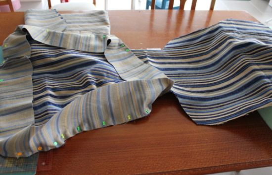Logo após, corte todas as partes. E posicione as laterais em uma das partes maiores, e prenda com auxílio dos alfinetes para costura.