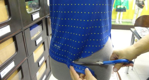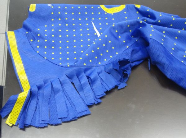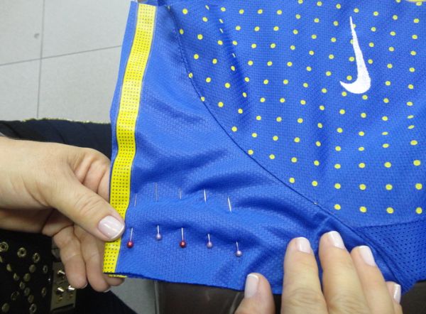 Logo após, corte um pouco do comprimento da manga para diminuí-las, para que o visual fique mais feminino, pois as mangas de camisetas de futebol são grandes e largas. Para fazer as franjas nas mangas, dobre a camiseta ao meio e coloque alfinetes paralelamente para marcar a distância entre uma tira e outra e segurar os dois lados da camiseta no mesmo lugar. A distância mínima deve ser de 2 cm e meio.