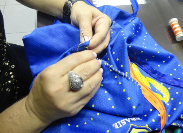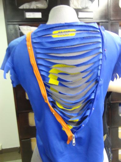 Para fazer esta diferente customização você irá precisar de: 1 camisa da seleção brasileira; 50 cm de zíper de duas cores; agulha de mão; tesoura; linhas coloridas para bordado número 8 (grossa); e alfinetes.