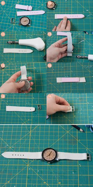 Em seguida, tire as pulseiras antigas de seu relógio e corte novas pulseiras no couro que você está utilizando. Coloque esta nova pulseira em seu relógio, colando com a cola E6000.