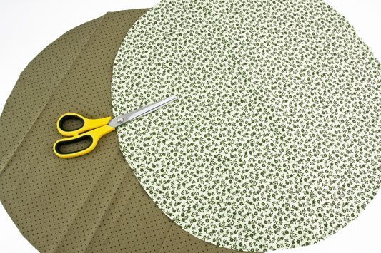 Comece cortando dois círculos com tamanho de 53 cm de diâmetro em dois tecidos com estampas diferentes.