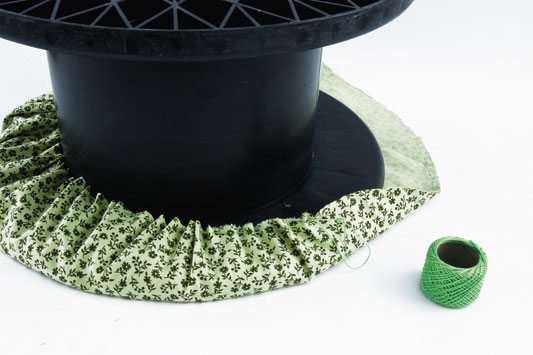 Em seguida, com o auxílio da linha para bordado e da agulha de mão, alinhave os círculos, puxando-os como se fossem um grande fuxico e posicione sobre as laterais do carretel.