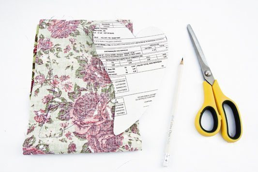 Logo após, transfira o molde de coração para o terceiro tecido escolhido. Recorte e deixe uma margem de costura de 0,5 cm.