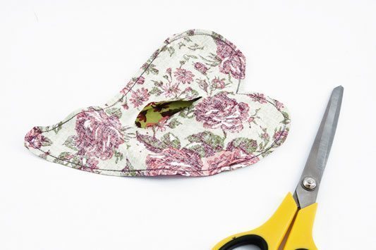 Agora, com o auxílio da agulha de mão e da linha para costura ou com o auxílio da máquina de costura, faça uma costura ao redor de toda a peça, e corte o centro do coração.