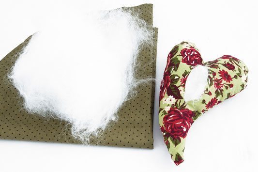Em seguida, vire o coração para o lado do direito do tecido e encha com a manta acrílica ou outro enchimento de sua preferência. E faça vários corações.