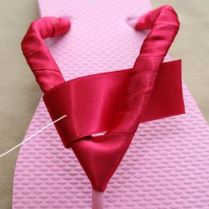 Comece aplicando um pouco de cola quente na base de uma tira lateral do chinelo. Depois comece a enrolar a fita larga escolhida, até chegar à outra base da outra tira lateral, mas formando um pequeno “V” na junção das duas tiras. E quando terminar de enrolar a fita larga, aplique também cola quente, para fixar a ponta da fita. E então cole um pedaço de fita larga na parte de cima do chinelo, na junção das duas tiras, para criar uma base para os seus enfeites.