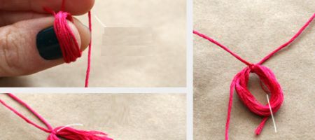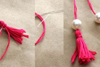 Em seguida, enrole no dedo algumas voltas de linha para bordado, amarre no meio e corte as pontas, amarre juntando as duas partes, para formar um pingente de franja. Depois passe a linha que está sobrando pela agulha para bordado e passe pelas pérolas maiores.