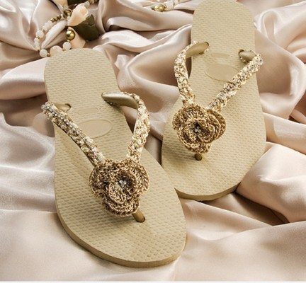 - Uma sugestão para ficar bonito o chinelo é elaborar a flor com a linha na cor bronze.