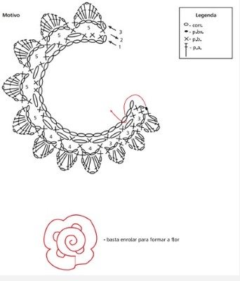 - Comece elaborando 27 correntinhas e siga o esquema da imagem até completar 27 cm.