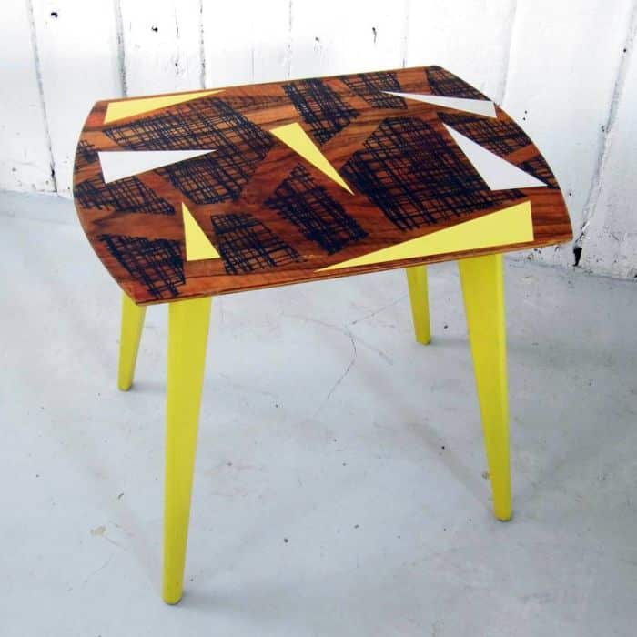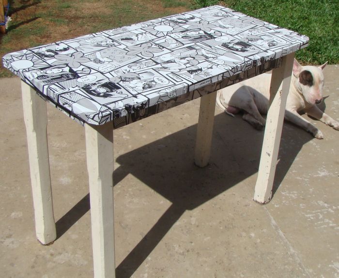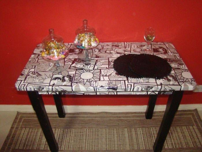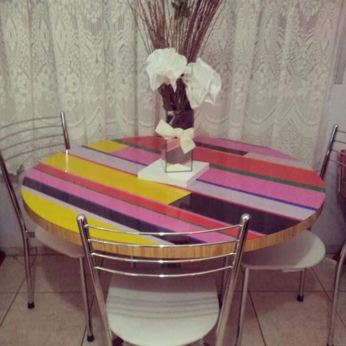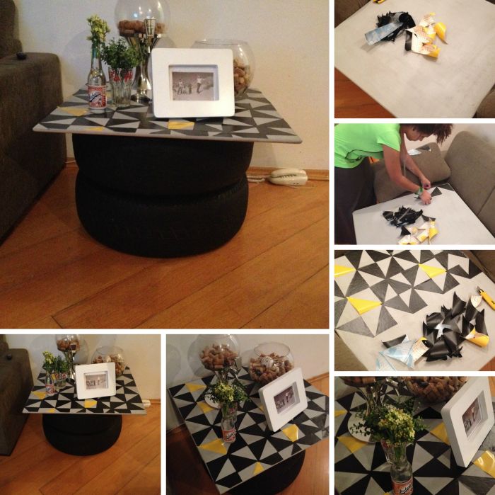 Você pode encapar a sua mesa colando pedaços de papel contact, formas geométricas, por exemplo.