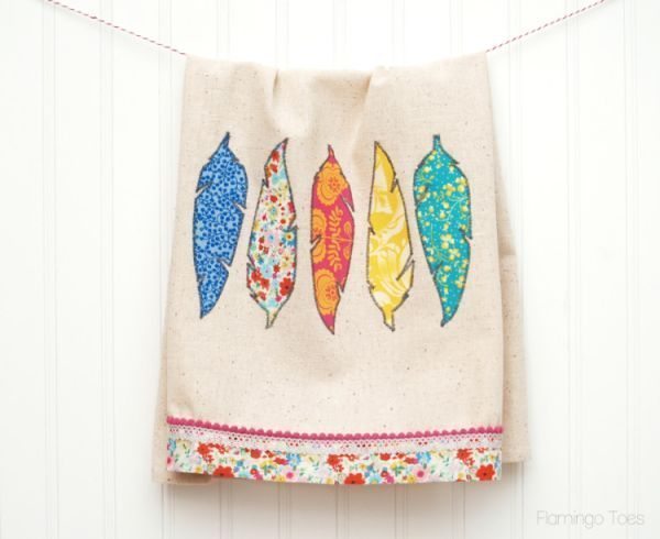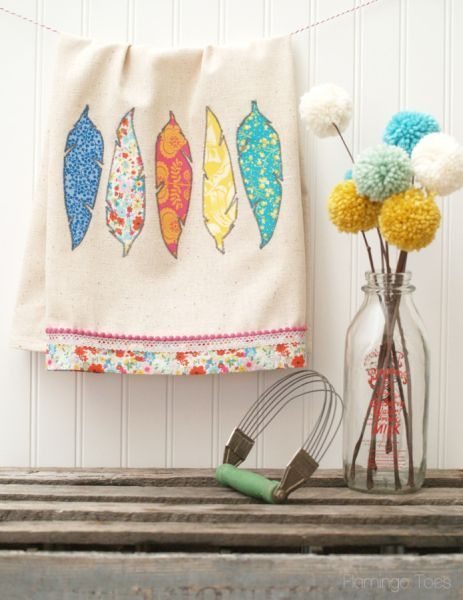 Créditos:http://www.flamingotoes.com/2014/02/pretty-diy-fabric-feathers-dishtowel/.