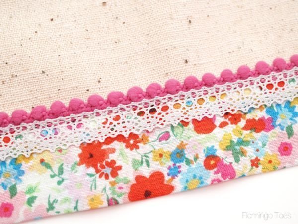 Agora, posicione uma tira de tecido na borda do pano de prato.