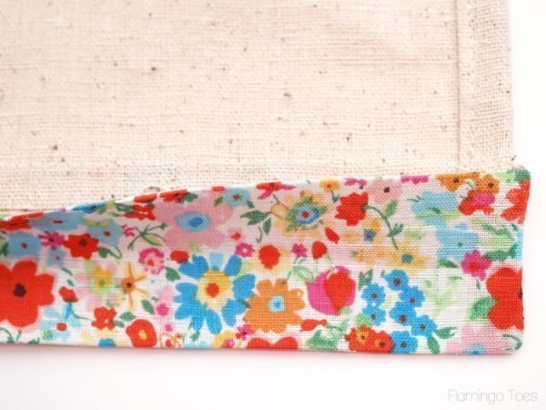 Logo após, vire o tecido para o outro lado, “encapando” a borda do pano de prato e vire uma barrinha. E passe uma costura.