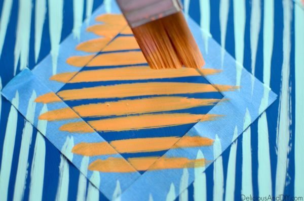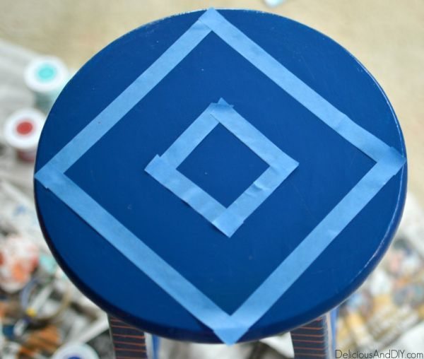 Logo após, posicione pedaços de fita adesiva no assento do seu banquinho, criando formatos que você deseja para os detalhes da sua pintura.