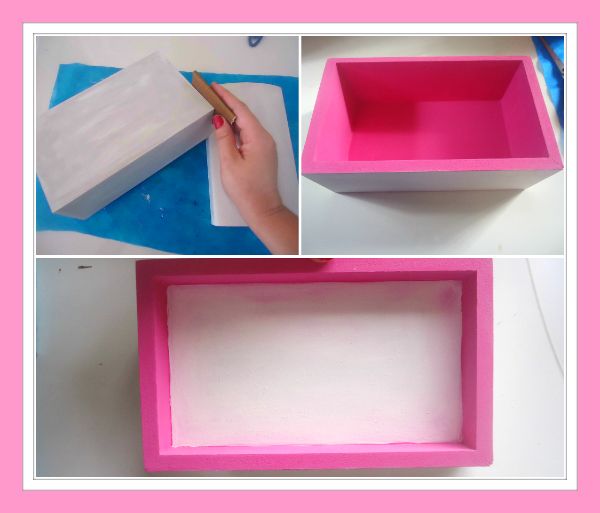 Comece tirando as dobradiças, com uma ferramenta específica. Depois passe base acrílica na peça e lixe. Aplique duas camadas de tinta acrílica branca em toda peça e, no interior, nas bordas e no fundo, aplique tinta rosa. Na tampa, deixe o interior branco e pinte somente as laterais e as bordas de rosa.