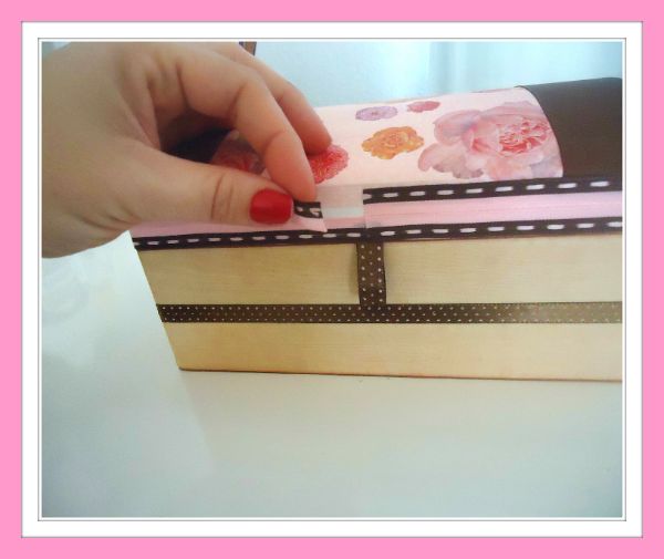 Logo após, pegue o guardanapo de decoupage, retire as duas películas protetoras, cole na parte interna da tampa e alise com a mão, protegida por plástico, para não correr risco de rasgar. Faça decoupage nas laterais e na parte de cima. Lixe as sobras com uma lixa de unha. Corte e cole, com cola para tecido, a fita na parte superior lateral do guardanapo. Para a parte interna da tampa, corte as fitas de sua preferência para fazer a moldura. Faça o biquinho dos cantos. No momento de colar, com cola de silicone, para não correr o risco de manchar, talvez precise acertar as pontas, de modo que fique com encaixe perfeito. Coloque a tampa sobre a base e comece a colar, com cola para tecido, as fitas que envolvem as laterais da tampa. Na inferior que cobrirá a alça, a emenda ficará para frente; a parte detrás esconderá a ponta da fita que estará na vertical.