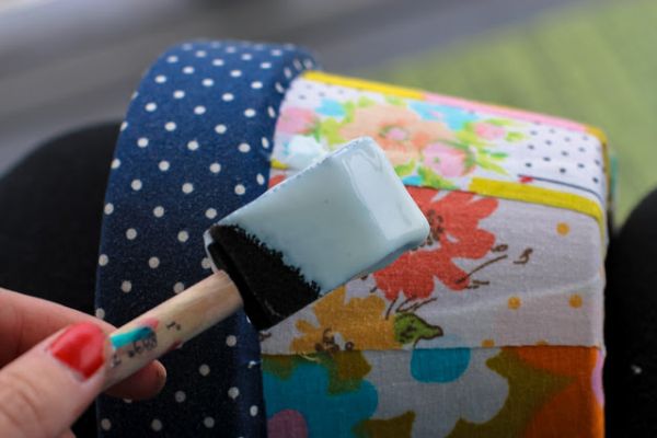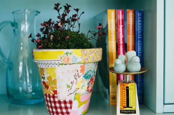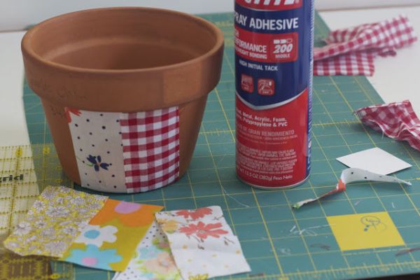 Em seguida, corte quadradinhos nos tecidos escolhidos ou corte no tecido alguns retângulos. Ou corte ainda o formato que você quiser em seus retalhos de tecidos. E quando tiver em mãos o número suficiente de pecinhas, comece a colá-la ao redor do vasinho escolhido, com o auxílio da cola em spray ou da cola para decoupage.