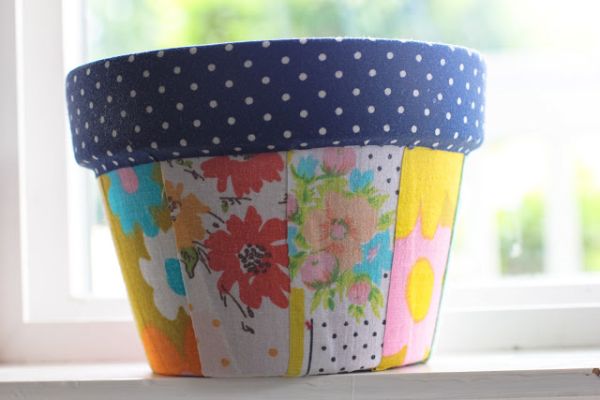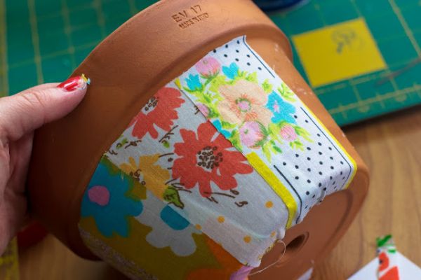 Logo após, siga colando os retalhos de tecido cortados. E fazendo um bom acabamento no fundo do vasinho.