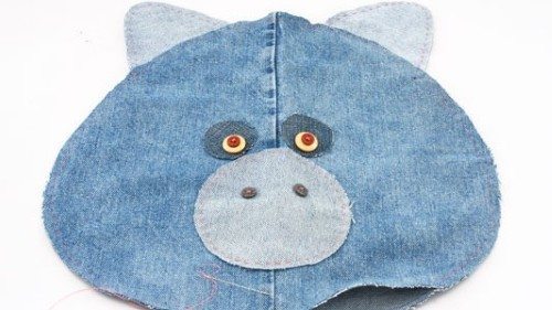 Agora monte a sua almofada com duas partes de tecido jeans e o rosto, seguido pela orelha, coloque o enchimento e feche.
