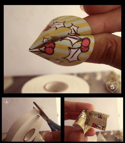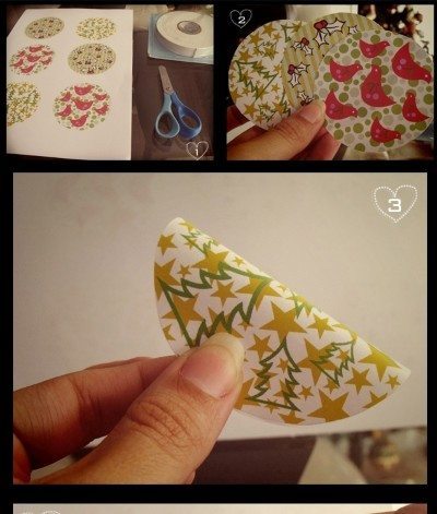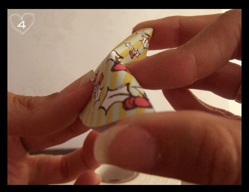 3. O papel deverá ficar como na imagem cinco, em seguida corte um pedaço de fita dupla face e coloque no meio do biscoito para ele ficar com o formato igual ao biscoito de verdade.