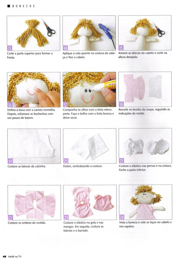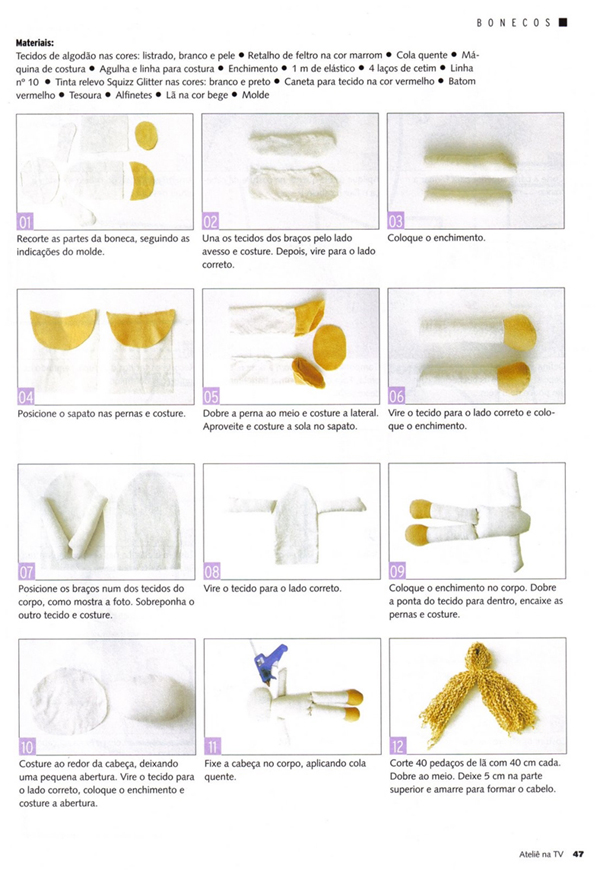 Comece separando todos os materiais que você vai utilizar em seu artesanato. Transfira as partes do molde para as respectivas cores dos tecidos escolhidos. Costure as pernas. Costure os pés nas pernas. Vire para o lado direito do tecido e encha as pernas. Faça os braços juntamente com o corpo. Costure as pernas no corpo. Faça a cabeça e cole no corpo. Faça os cabelos do jeito que você quiser.