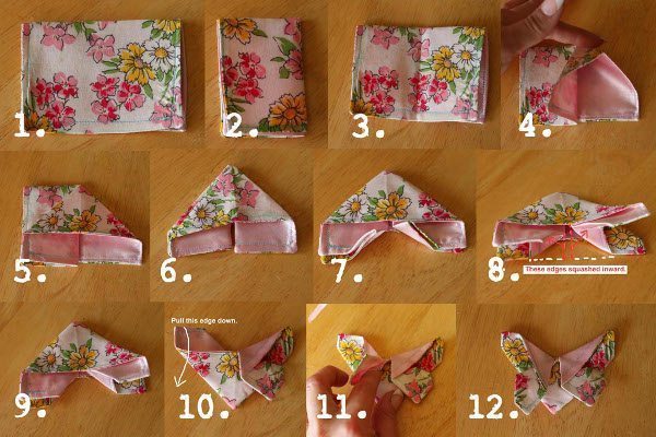 Em seguida, com o auxílio do ferro para passar roupas, se você quiser, ou vinque a peça somente com os dedos, dobre o retângulo de tecido ao meio, pelo sentido do comprimento. Depois dobre ao meio novamente e vinque. Abra a peça e faça uma dobra no lado direito da peça. Faça a mesma dobra no outro lado. Eleve os cantos inferiores internos e coloque-os para dentro, dos dois lados. Agora leve um lado para a direção da ponta. Então, faça o mesmo do outro lado, para criar a sua borboleta.