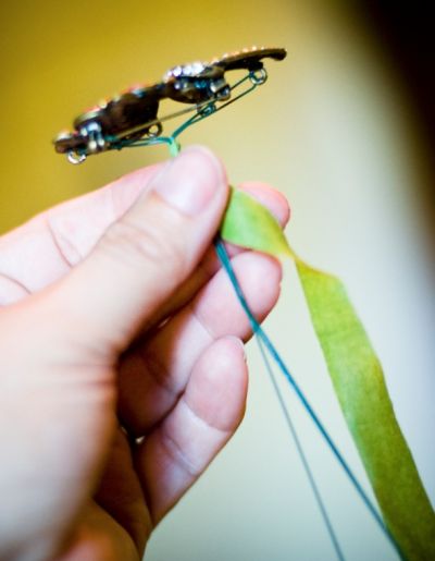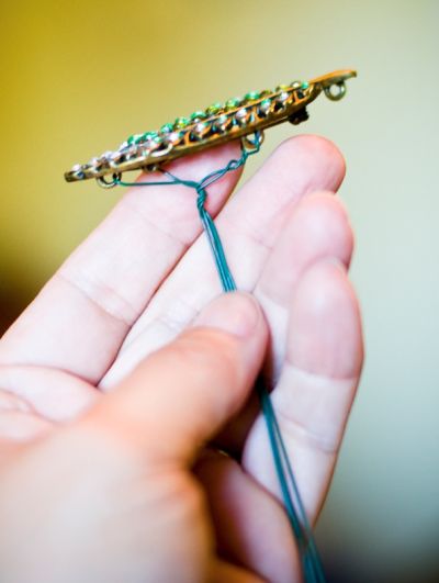 Comece passando alguns pedaços de arame pelo broche, torcendo o arame e deixando uma boa sobra para ser o caule da peça.