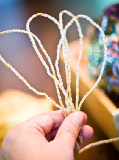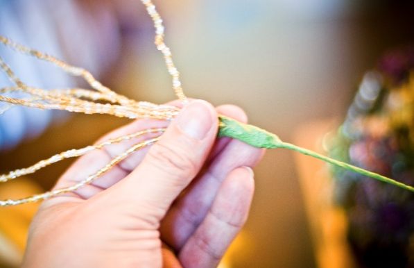 Em seguida, posicione estas laçadas de miçangas ao caule e prenda com mais fita floral verde.
