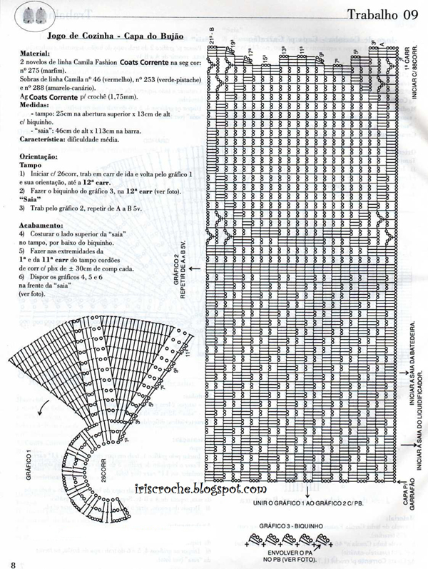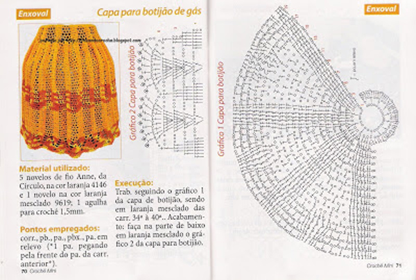 Comece separando todos os materiais que você vai utilizar no processo de como fazer capa de botijão de crochê. Comece a fazer a sua capa pela parte superior, a parte circular, faça 36 correntinhas, mais 3 para virar. Vá seguindo o gráfico da parte superior, até chegar ao tamanho do círculo do botijão, mas sempre trabalhando no esquema “vai e volta”, para que a sua capa fique aberta. Faça agora o segundo motivo, o mais aberto, também seguindo o gráfico, faça 13 carreiras ou o número necessário de carreiras para atingir o tamanho do “corpo“ do seu botijão. Faça agora a parte grande do barrado. Para finalizar a sua peça, faça o biquinho na barra e na divisão do topo com o “corpo” da capa. E está pronto!