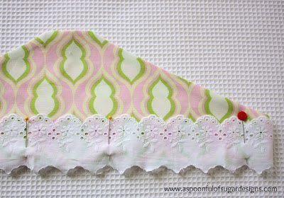 Logo após, fixe o bico de laise ou o bico renda na barra da peça, porém com os bicos para cima e com o lado do avesso para fora. Depois costure ao redor da peça.