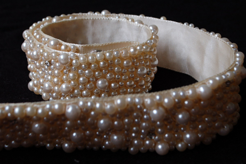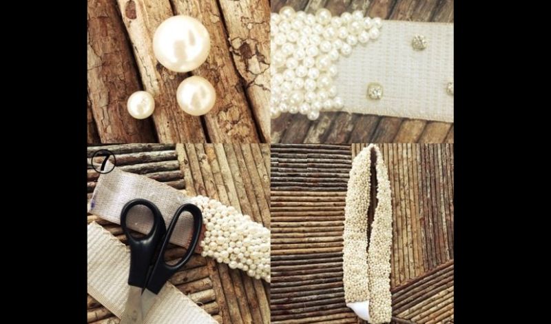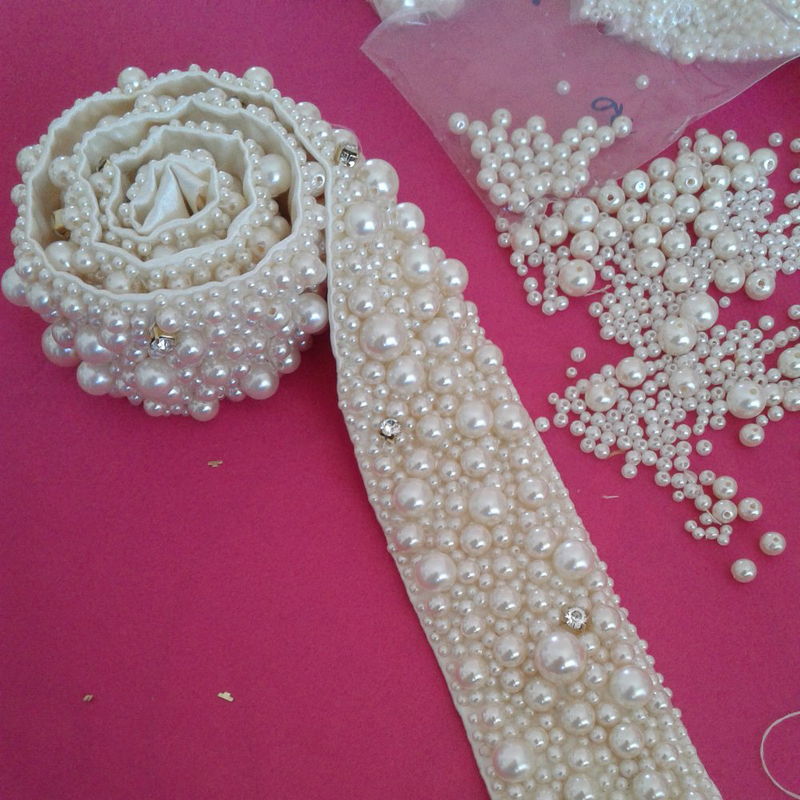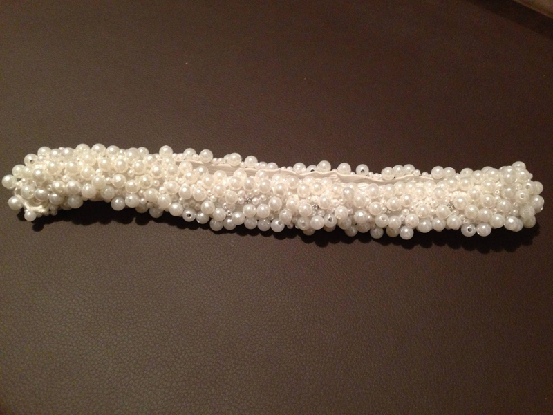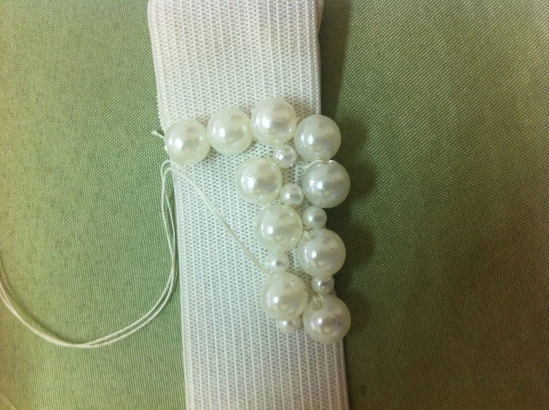 Para finalizar a sua peça, basta costurar as pérolas por todo o elástico. E está pronto! Você também pode costurar as pérolas e strass em uma faixa de tecido ou em um cinto de tecido.