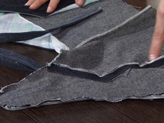 Marque e corte o tecido jeans, depois você deve chulear todas as peças e costurar com a costura reta, tomando o cuidado de juntar direito com direito. Depois é necessário que você presponteie as peças frontais, faça as abas em tecido xadrez seguindo a forma da peça, lembrado que na parte superior haverá uma presilha com alças trançadas;