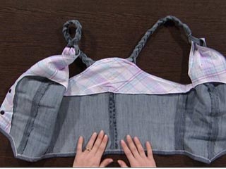 1º Passo: Marque e corte o tecido jeans, depois você deve chulear todas as peças e costurar com a costura reta, tomando o cuidado de juntar direito com direito. Depois é necessário que você presponteie as peças frontais, faça as abas em tecido xadrez seguindo a forma da peça, lembrado que na parte superior haverá uma presilha com alças trançadas;