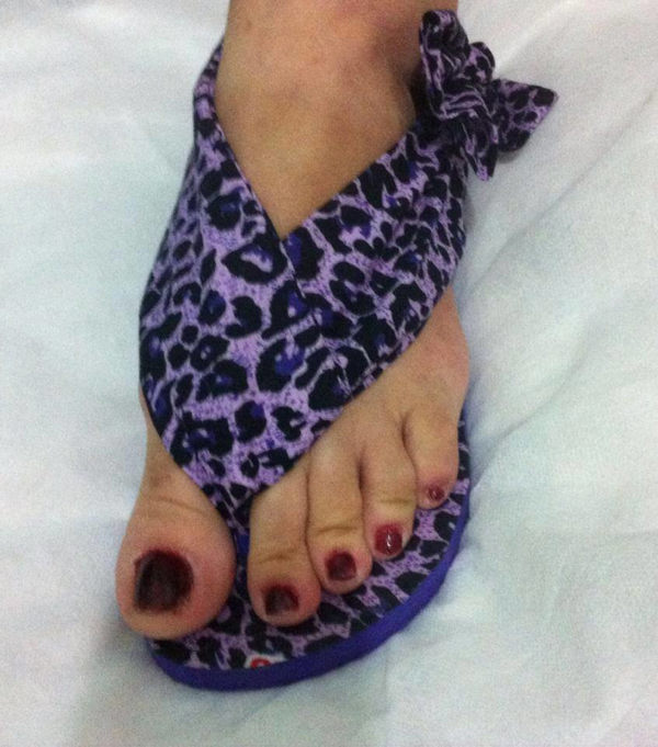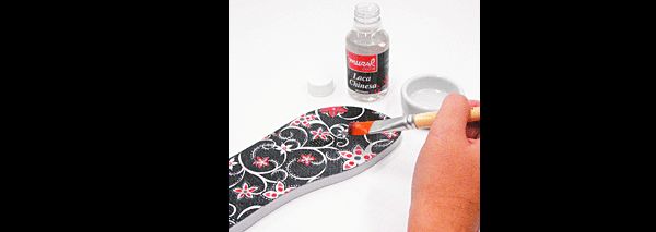 Para finalizar a sua peça, aplique uma camada de laca chinesa, espere secar por 72 horas, e recoloque as tiras. E está pronto! Mas só use os chinelos após 24 horas de recolocadas as tiras.