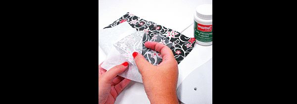Aplique a cola para decoupage, com o auxílio de um pincel comum, e deixe secar um pouco.