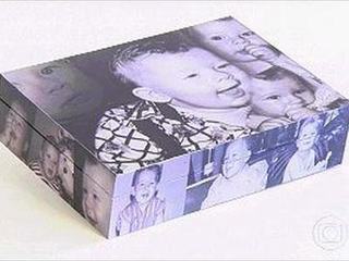 – Quando já estiver seca pegue uma foto grande e coloque em cima da caixa para você medir o tamanho, se necessário corte o excesso, passe cola branca na caixa e cole a foto. Passe a mão por cima da foto retirar possíveis bolhas, repita isso em todos os lados da caixa.