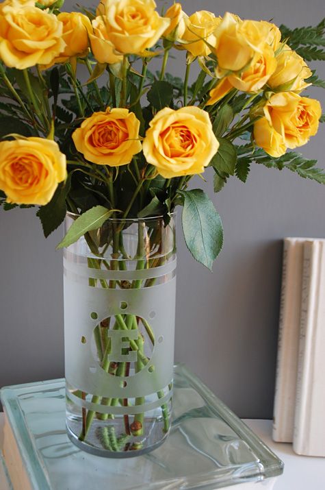 Créditos:http://www.merrimentdesign.com/how-to-etch-a-glass-vase-and-free-monogrammed-diy-glass-etching-template.php