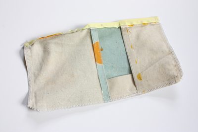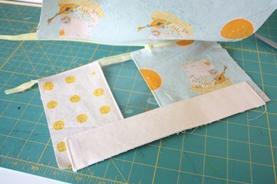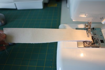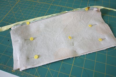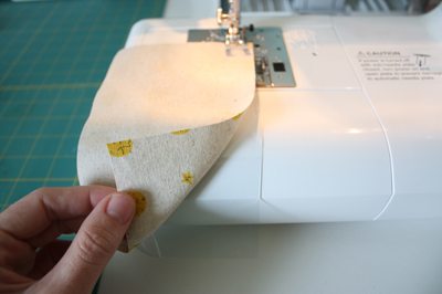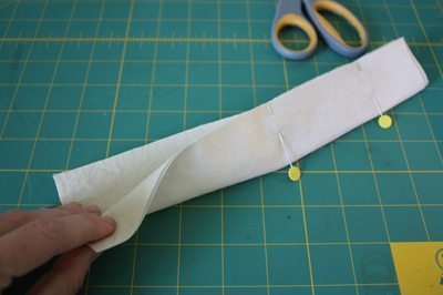 Em seguida, fixe a entretela na parte que será a aba e dobre ao meio, pelo sentido do comprimento e com o lado do direto para dentro.