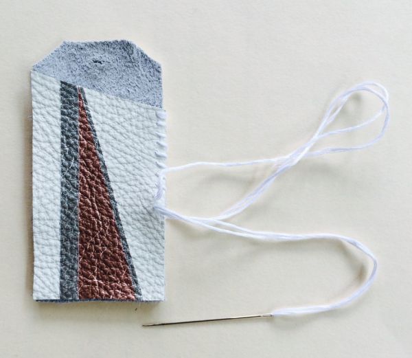 Em seguida, passe quantos fios de linha para bordado você quiser pela agulha para tapeceiro e posicione uma parte de couro sobre a outra, com os lados do direito para fora. Depois comece a costurar as duas partes juntas. E faça um pequeno corte na ponta da parte mais comprida.