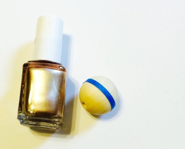Agora, se você quiser, posicione um pedaço de fita adesiva em uma das contas de madeira e pinte-a com um esmalte para unha.