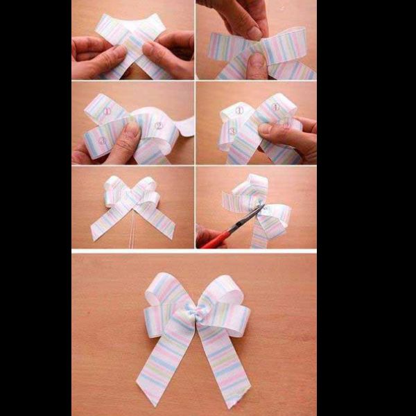 Use vários tipos diferentes de fitas para criar o seu laço. Dobre várias camadas e amarre no meio, com tamanhos diferentes de fita e estilos diferentes, para criar um alço bem cheio. A partir deste modelo de passo a passo você pode criar laços com quantas camadas quiser.