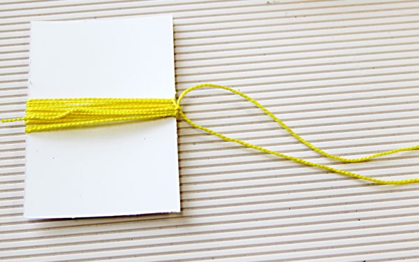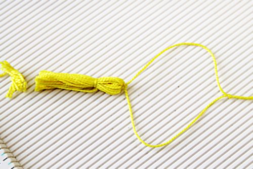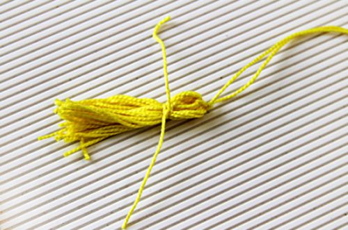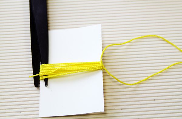 Logo após, faça o pendente de linha. Para isso você deve utilizar um quadrado de papelão para ser um suporte. Então comece a enrolar a linha ao redor de pedaço do papelão e quando estiver com a espessura de sua preferência você deve dar um nó em um dos lados. Depois corte a outra extremidade. Pegue um pedaço da linha amarela e amarre dando um nó um pouco abaixo da base, para formar uma “cabeça”. E finalize o pendente dando um nó na linha, formando uma laçada e acertando com a tesoura as pontas do pendente.