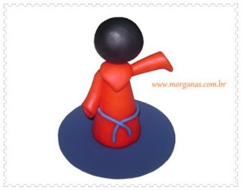 Agora faça um cinto com um pedaço de biscuit na cor azul claro para dar destaque e una os braços do personagem, um em cada lado. Faça também o detalhe do vestido.