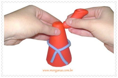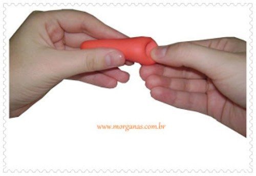 Agora é a hora de modelar o braço do Mickey com a ajuda do dedo, amasse a parte inferior, onde será colocada a mão do personagem.