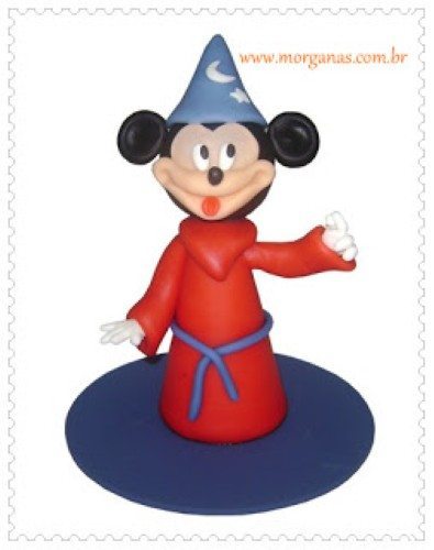 Agora faça a cabeça do Mickey, cobrindo uma bola de isopor pequena com um pedaço de massa de biscuit na cor preta. Agora é a hora de fazer o rosto do personagem, por isso comece inserindo a parte de baixo do rosto em formado de coração, depois coloque a boca, com a ajuda de uma esteca faça a marcação central e as laterais. Faça dois círculos ovalados para colocar no centro dos olhos e dois menores na cor preta. Prepare as orelhas e o chapéu e pronto, a sua peça está pronta é só deixar secar e decorar onde desejar.