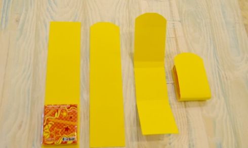 Comece cortando tiras na cartolina amarela, com a mesma medida da largura da guloseima escolhida e com comprimento que permita dobrar a tira sobre a guloseima e cobri-la.