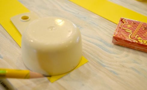 Em seguida, arredonde uma das pontas da tira (a ponta oposta à ponta que ficará a guloseima escolhida) com o auxílio da peça circular e de um lápis ou com o auxílio de um compasso.