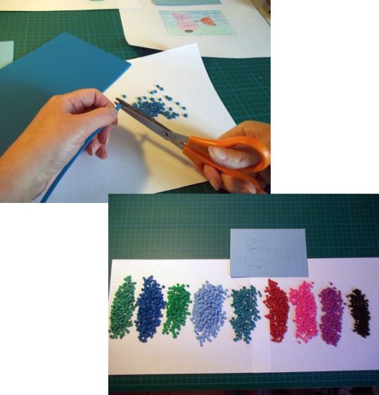 Logo após, corte pequenos quadradinhos nas cores de EVA que você vai utilizar em seu desenho.