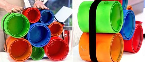 Para juntar todas as latas basta usar o elástico. O tamanho do elástico deve ser proporcional ao tamanho total de todas as latas juntas. Para unir as pontas utilize a linha e agulha reforçando bem nas bordas. A partir de três latas você pode encaixar as próximas, mas aos poucos. E está pronto seus nichos de lata!